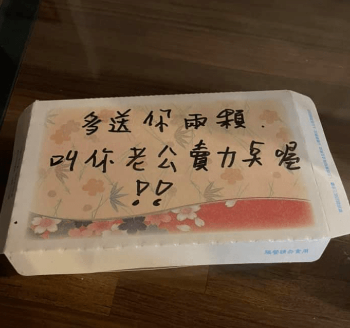 一名人妻為了和老公有更多親密接觸,在外送平台點了生蠔、鮮蝦料理,並在訂單上抱怨「我老公很久沒有跟我有愛的火花了」,希望店家能夠多給一點生蠔,老闆二話不說,直接加碼多送2顆生蠔,還在餐盒上寫:「叫你老公今晚賣力點喔!」讓網友們笑翻。