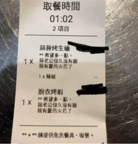 有顧客訂購了蒜蓉烤生蠔和脫衣烤蝦兩樣餐點,並在備註欄寫著「希望多一點,我老公很久沒有跟我有愛的火花了」。