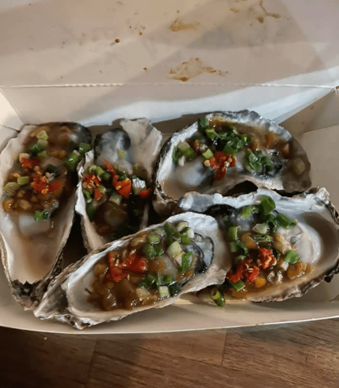 直接阿莎力應客人要求,多送2顆生蠔,並在便當盒上寫著「多送妳兩顆,叫妳老公賣力點喔!」