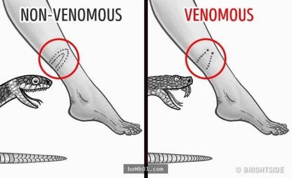 11.判斷蛇有沒有毒:毒蛇的眼睛是豎瞳,無毒蛇的眼睛是圓瞳;毒蛇腹部的鱗片重疊,無毒蛇腹部的鱗片成叉狀;被毒蛇咬傷後門牙位置的洞比較大,被無毒蛇咬傷的話只會留下兩排牙印。