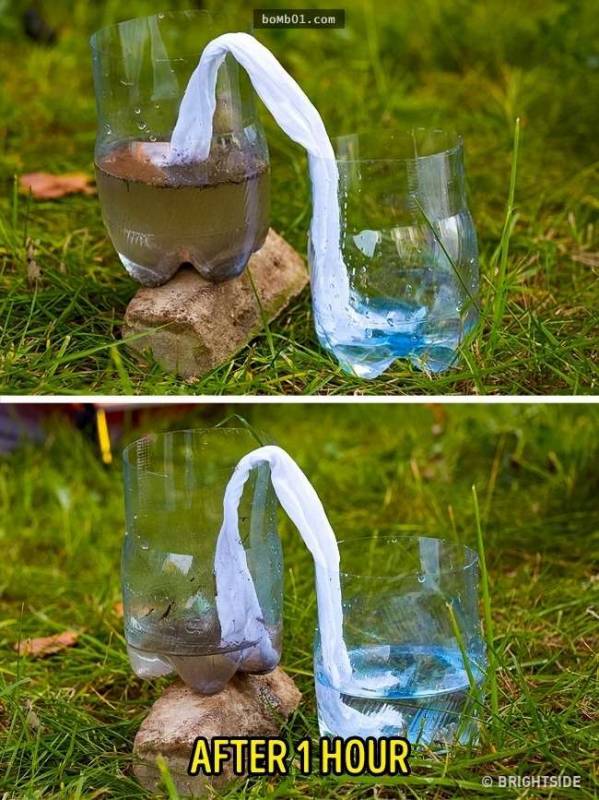 2.用T恤凈化水:將裝有髒水的瓶子放得高一些,空瓶放得低一些。從T恤上撕一塊布,一端放在髒水瓶里,另一端放在空瓶里。這樣能夠一定程度上凈化水,但最好還是燒開再喝。