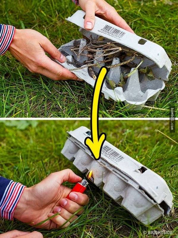 1.把干樹枝放在空蛋盒裡,能夠快速生火。使用蛋盒能夠快速生火,而且溫度很高,哪怕有風、樹枝很潮濕也能點燃。