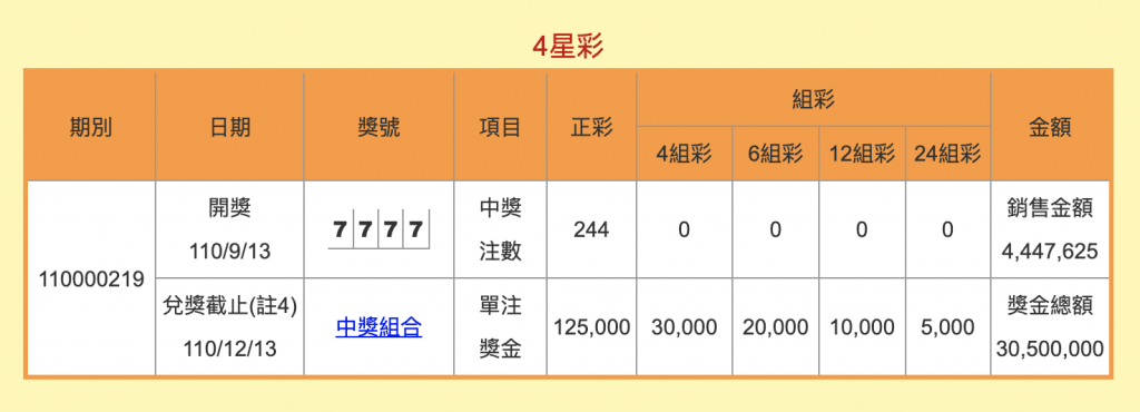 台灣彩券4星彩昨(13)日開獎,竟首度開出「7777」的鐵支號碼,全台共有244注中獎,獎金總額高達3050萬元,扣除本期4星彩銷售金額444萬餘元,狂虧了約2600萬元,引發彩迷熱議。 第110000219期4星彩昨晚開獎,獎號十分罕見,竟是4個數字都是7的鐵支號碼。