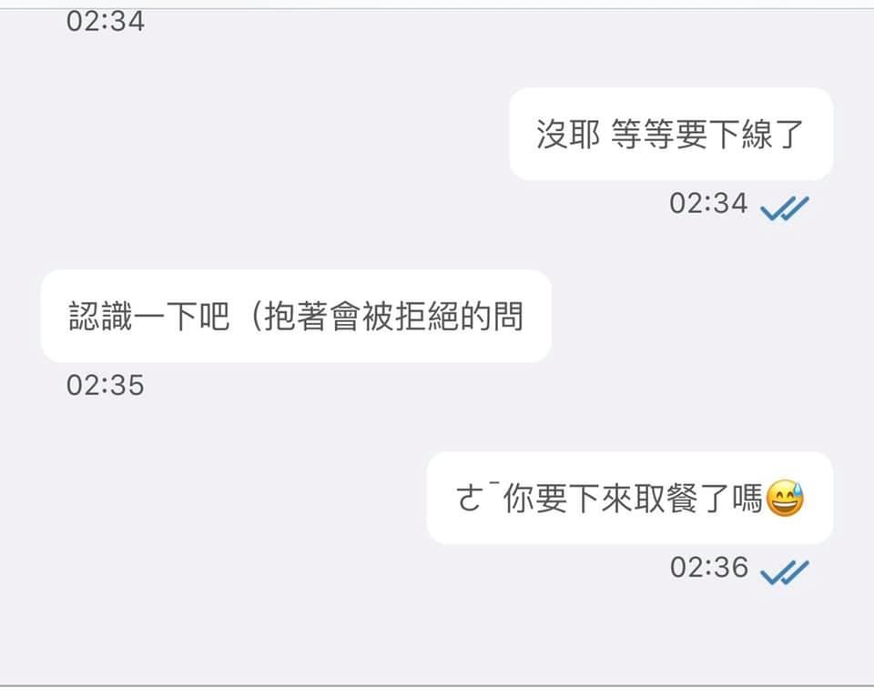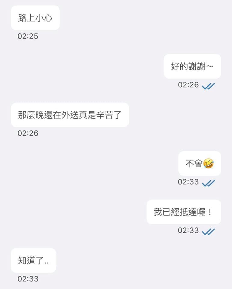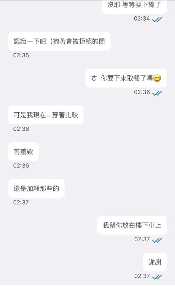 外送員表示一開始看到對方傳了一句「路上小心」,讓她覺得還蠻窩心,結果沒想到,對方接下來的話讓她覺得很無言,沒想到對方話鋒一轉直接問想認識一下,甚至在外送員詢問是否要下樓取餐食,還表示自己穿得有點「害羞」,言下之意要外送員幫他送到家門,嚇得外送員表示『幫你放在樓下的機車上了』。