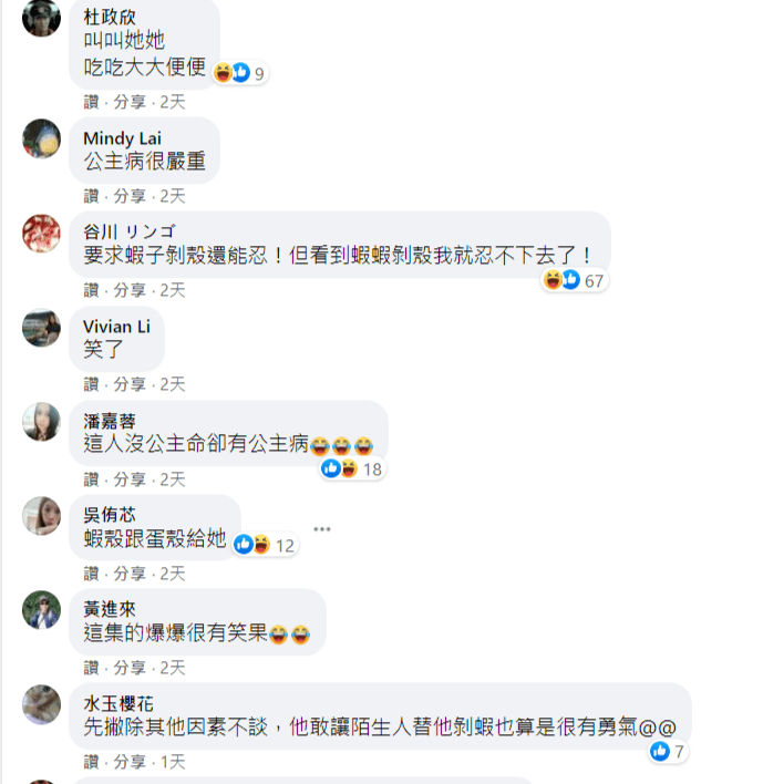 其他網友則留言「要不要順便幫她吃掉?」、「不要蛋黃可以理解,但還要順便撥蝦…真的傻眼」、「乾脆麵麵也幫她吹燙燙好了」、「優良店家拒絕的好」、「公主嗎?」、「 疊字裝什麼可愛」、「剝殼?難道又是個公主病?」。