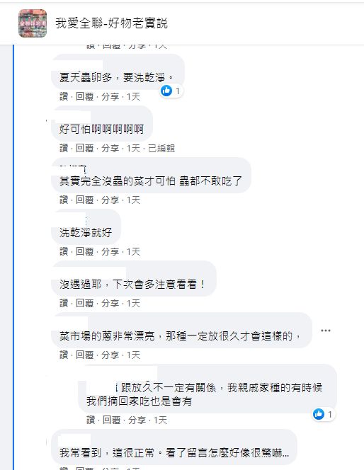 而畫面曝光後,立刻有不少網友回應「這是蟲便便不是蟲卵」、「那是蟲的大便,不是卵。蔥普遍都會有,只是一般人少注意到」、「我買蔥一定會清洗內部,因為怕有蟲或泥土」、「青菜內部空心的大都會這樣,要特別注意」、「夏天蟲多,要洗乾淨」、「會有這狀況哦,一定要洗乾淨,要煮熟,我會洗乾淨後,打燈照檢查一下」、「這幾年天氣熱,蔥會有蟲蟲躲在蔥理,很正常」、「我娘家住三星,也有種蔥(自用),沒用農藥,蔥管裡面很常會有蟲和蟲卵,我洗蔥一定是每根剪開仔細檢查」。