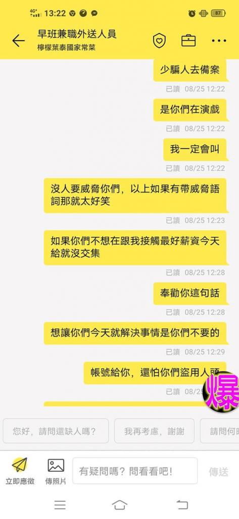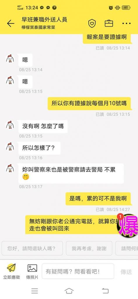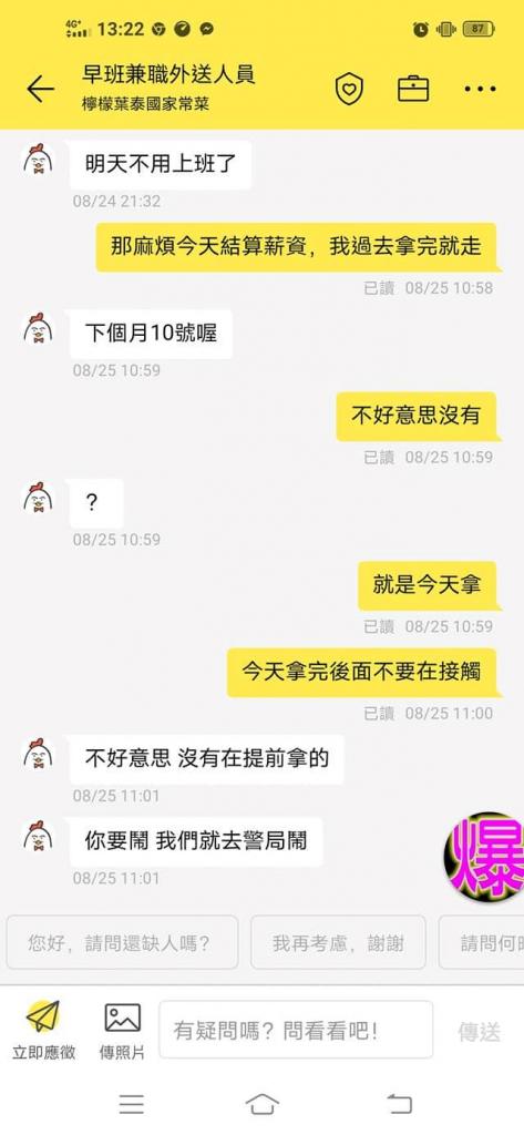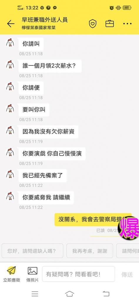 但是根據原po自己提供的截圖,老闆並不是不給他薪水,而是請他在下個月領薪日的時候來領自己8月的薪水,但原po要求就是要今天結清,但老闆拒絕並表示『沒有人一個月領兩次薪水的,薪水沒有在提前拿的』雙方因此起了口角爭執,甚至兩人還互嗆自己常上警局、法院。