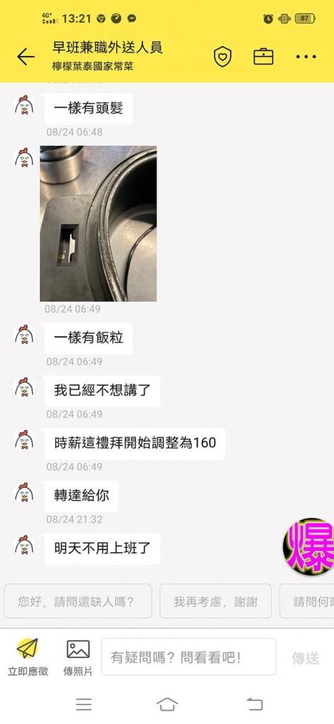 『請高雄各位大家不要到龍華市場這位(攤)檸檬葉泰國家常菜攤販買便當,因為雇主解僱員工,並說8月薪資不一定會給予,還請大家不要去買取,老闆與老闆娘很霸.道,目前會前往報警了,市場的其他攤販都不想予(與)他們接觸,說雇主很霸.道,以下照片是反白的雇主回覆,反黃是員工。他們便當都有螞蟻跟蟑螂跑過,如果不建議(介意)可以去買。』
