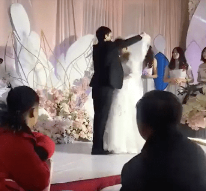 根據新聞媒體報導,這場婚禮是在河北承德舉辦的。而從影片畫面中可以看到,有一對新人正在台上接受嘉賓的祝福,其中新浪還甜絲絲地為新娘掀開頭紗,但就在鏡頭被拉近聚焦在新人身上時,站在新娘身後的伴娘卻意外引起了大家注意。只見他身穿白色蕾絲袖長裙,手裡捧著一束花,光看頭部以下,還會覺得很正常;然而往上一看,那粗眉小眼,就算戴了假髮,依舊能讓人一眼看出來就是個男兒身啊!