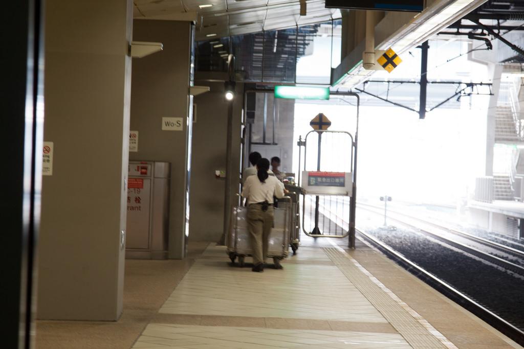 她也是穿着白色的制服,卡其色的直筒褲,帶著無線電,很專業的指引客人往手扶梯的方向,重複說著「謝謝搭乘」,且不忘帶著那不失禮貌的笑容。