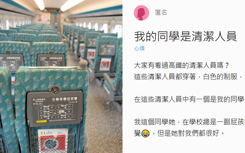 原po在 Dcard 論壇上表示,自己在高鐵站下車時,發現其中一位班上的同學原來是高鐵的清潔人員。