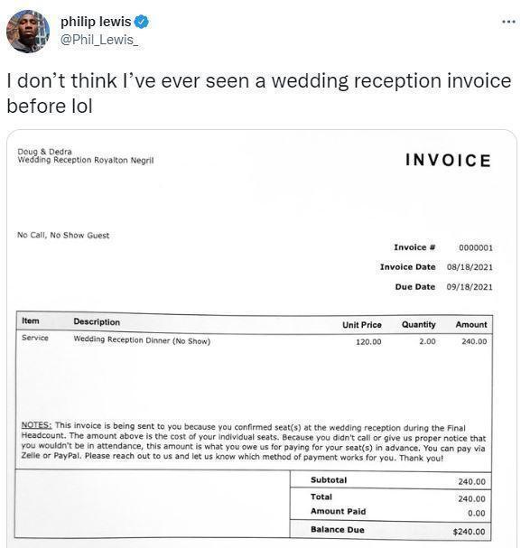 Philip於25日在推特上po出一張發票,表示自己從未見過婚宴寄來的收據。從圖片中可以看到,新人在發票中向賓客說明,因為賓客沒有打電話或用其他方式通知無法出席,導致婚宴會場無故出現空位,因此新人認為賓客應該支付座位費240美元。