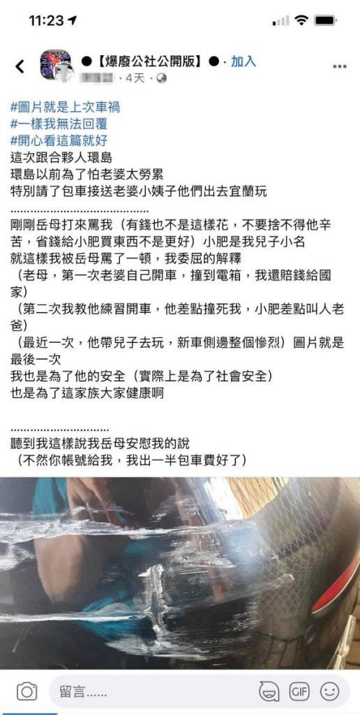 原PO在臉書社團「爆廢公社公開版」發文表示,「這次要與合夥人一起環島,出發前怕老婆太累,因此特別包車接送老婆與小姨子去宜蘭玩」。