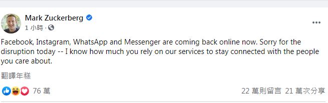 因此臉書創辦人祖克柏(Mark Zuckerberg)在臉書發文道歉,表示Facebook, Instagram, WhatsApp、Messenger現在重新上線了「抱歉今天打擾了」、「我知道你有多依賴我們的服務與你關心的人保持聯絡。」。