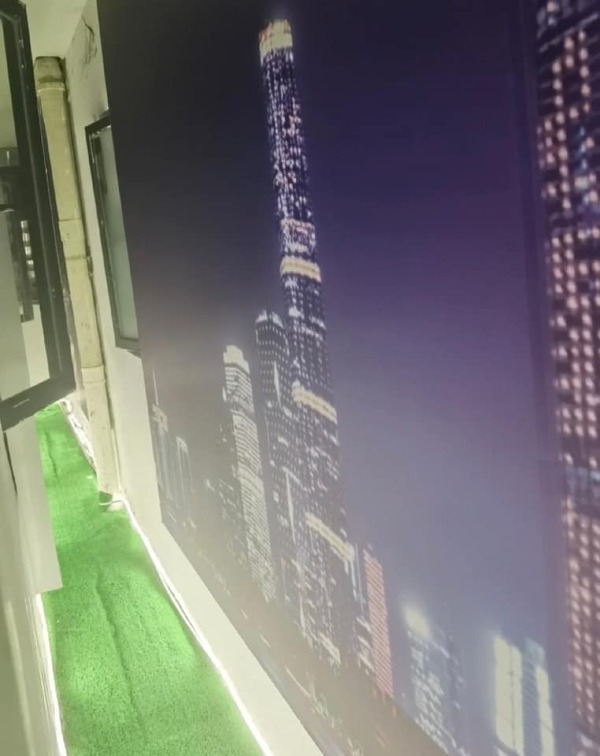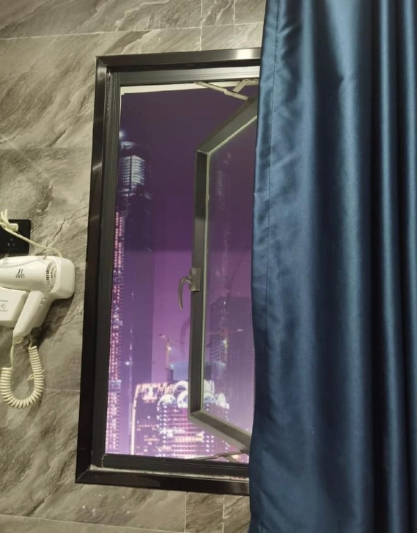 ✪打開窗,發現外面的夜景是印刷海報。(圖/翻攝自 爆廢公社)