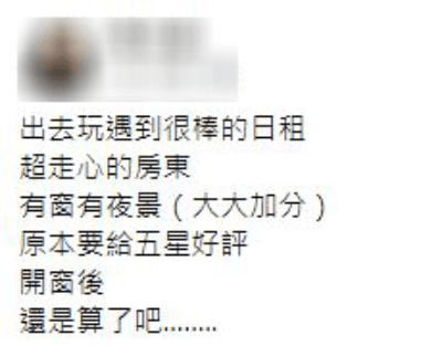 疫情趨緩,再加上國慶連假期間,許多民眾會攜家帶眷出去遊玩。但是選擇住宿可是一大學問,除了要乾淨舒服之外,若能有浪漫的美景,可說是超級大加分,一名女網友住日租套房,原本不期不待,但是看到窗外有五星級的夜景,覺得賺到了,興奮地將窗戶打開,沒想到開窗後下場超悲劇,好心情全沒了,她將照片PO上網,網友們全笑翻。