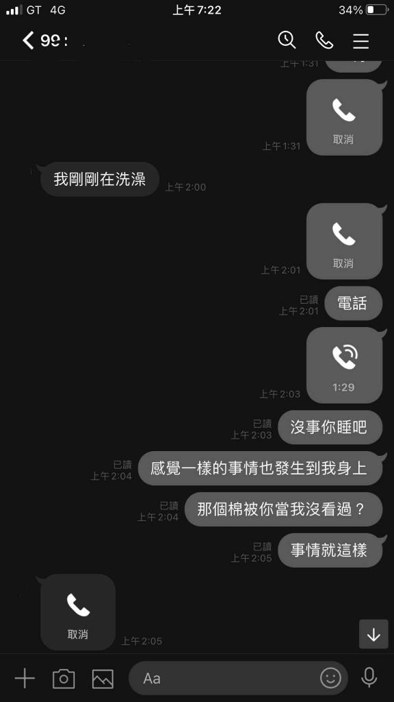 隔天凌晨12點半,原PO打電話給確認,女友說還在外面跟朋友聊天,他提醒對方到家說一聲。後來,到了凌晨1點半,他遲遲等不到女友報平安,撥電話對方未接;凌晨2點,女友傳訊回說剛在洗澡,他馬上打視訊電話,但對方已讀沒接。