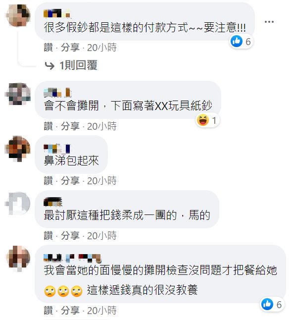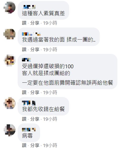 貼文曝光後也吸引其他外送員回應,大家紛紛留言表示「洗衣機拿出來的?」、「這完全就是故意的啊」、「這看起來是新鈔,而且是故意揉成團的,這種人太可惡了」、「不尊重錢,也不尊重人」、「我會把他餐點搖一搖拿給他」、「這是在 糟 蹋 人吧」,不少人認為無論原因為何看起來都相當不 禮貌,不過也有網友指出另一種「黑心」的可能。