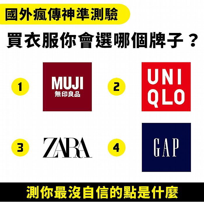 幾乎每個人都有特別偏愛的品牌,而如果要買衣服你會優先買上列哪一間品牌的衣服呢?測測看你最沒自信的點是什麼!