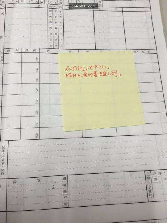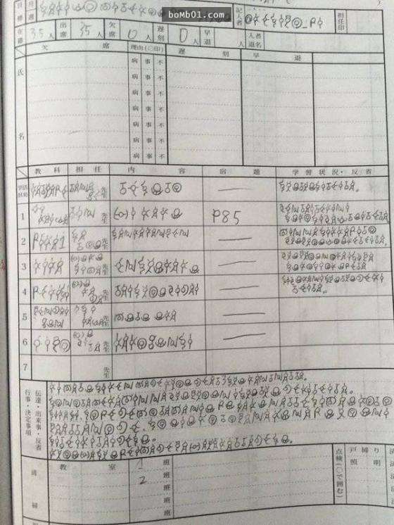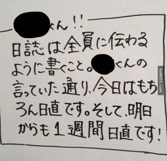 ✪打開值日生日誌的老師想必是超級傻眼,完全不懂這什麼鬼!他在當天的值日生日誌上留了紙條說:「請不要開玩笑,包含昨天的請一起重寫。」