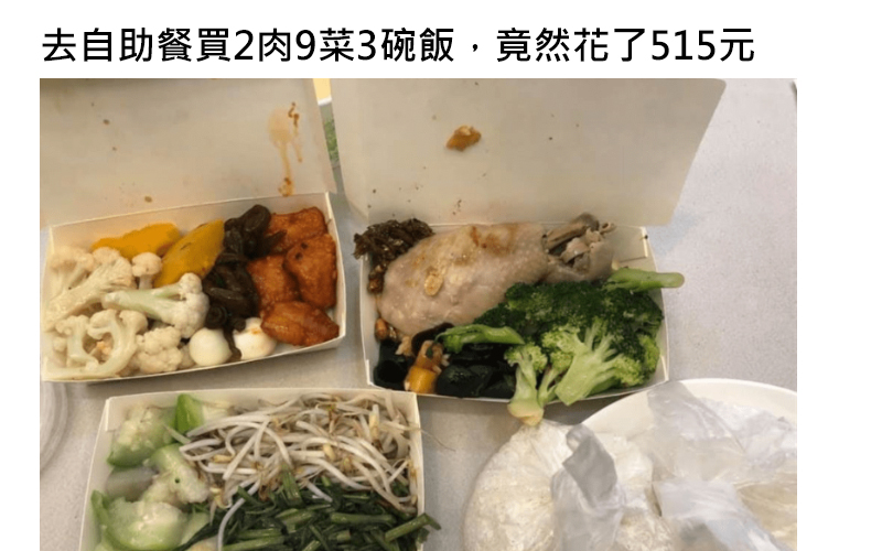 該名網友發文分享,中午去汐止中興路上的自助餐買午餐,夾了2樣主食、9道菜及3碗飯,沒想到竟要價515元,令他當場傻眼,以為自己聽錯了。