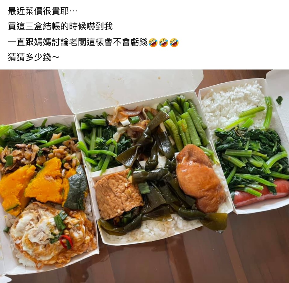 總而言之,自助餐神秘的計價方式,老是讓人雲裡霧裡看不透?日前就有網友在臉書社團中PO出一張照片,畫面中是三份自助餐便當,有肉、有菜營養均衡,而且分量超級多,白飯也給得很夠,沒想到結帳時,原PO一度懷疑自己耳朵聽錯,老闆居然喊出超 佛 價格,讓許多網友下巴都要 掉 了。