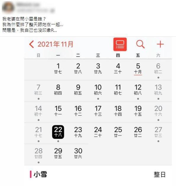 一名網友於臉書社團《爆廢公社》上貼出一張手機行事曆截圖,只見畫面中,日期設定在2021年11月22日,但下方卻顯示「小雪」二字,甚至強調整日。氣得質問他「小雪是誰?為什麼排了整天跟她在一起…」該問題也讓原PO傻住,直呼「問題是,我自己也沒印象R…」
