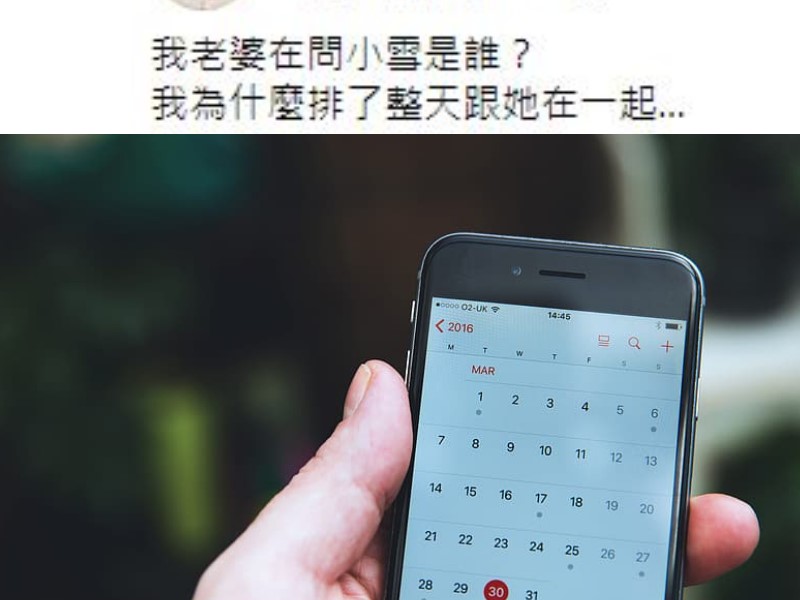 近年來科技逐漸發達,現代人手一機的情況早已見怪不怪,而不少人會透過手機行事曆記下行程,就怕不小心忘記重要的行程。一名網友在臉書發文表示,他的老婆看到自己的行事曆之後暴怒,質疑丈夫為何在行事曆空下整天跟「小雪」約會,但當真相揭曉後,就引來一票網友笑翻留言。