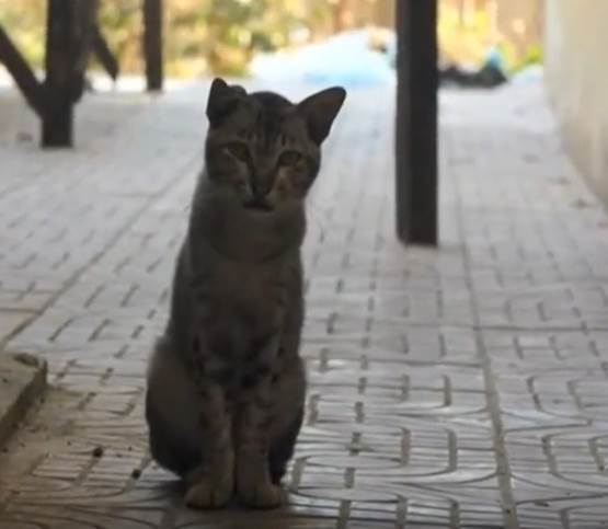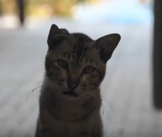 鏟屎官呼喚狸花貓的名字,狸花貓聽到熟悉的聲音,搖晃著腦袋似乎是在思索什麼,狸花貓不敢靠近鏟屎官,鏟屎官也不敢輕易接近狸花貓,很擔心狸花貓因為害怕在次跑了。