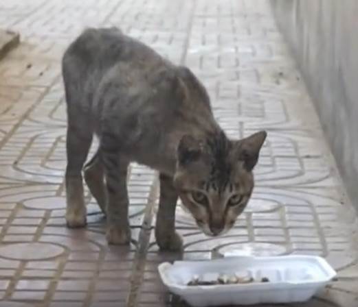 狸花貓小心翼翼的靠近食物,雖然低下頭,但眼神還是看著面前既熟悉又陌生的人。