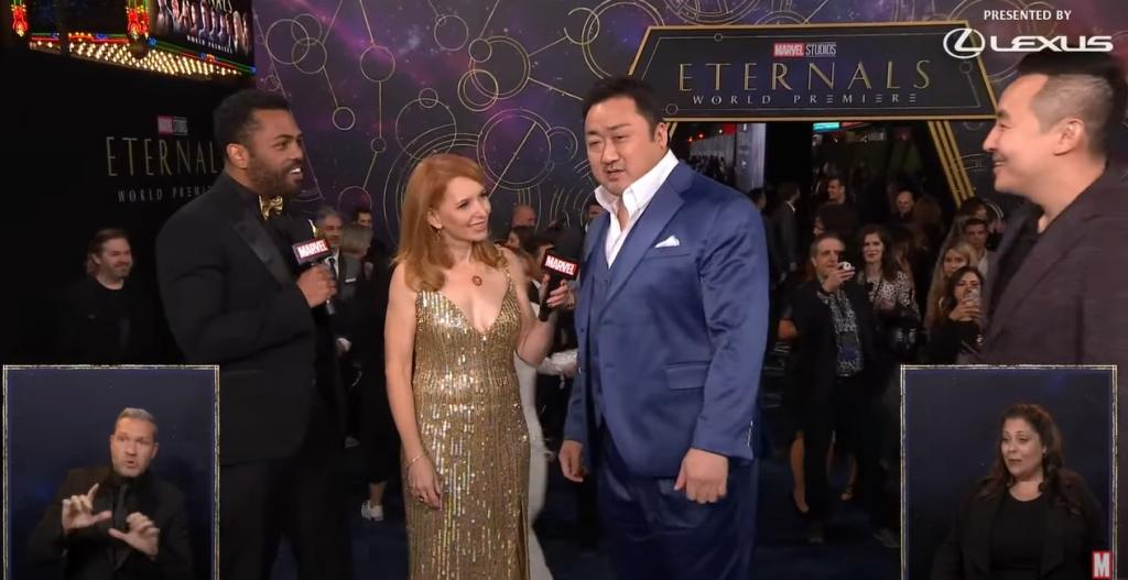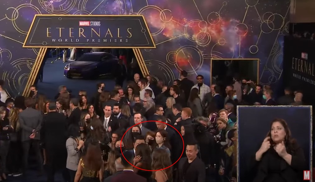 《永恆族》19日在洛杉磯杜比劇院盛大舉行首映會,現場眾星雲集,許多好萊塢大咖也受邀參與盛會,其中馬東石更是低調帶著交往六年的女友「藝正花」到場,釋出的影片可以看到戴上口罩的她在紅地毯默默跟在馬東石後方,透過男友的牽線與莎瑪海耶克打招呼,超暖的互動立刻成為焦點!同時馬東石也跟隨導演趙婷接受現場媒體訪問,更以流利的英語對答。