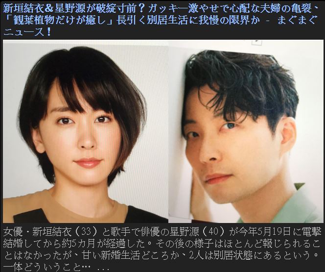 新垣結衣與星野源結婚將近5個月,日前遭到日媒《MAG2NEWS》報導指出,剛結婚的他們雖然住同一棟大樓,卻選擇「分居」,各自住在自己家,偶爾會到對方家相處,其實早在兩人發出的結婚聲明上就白字黑字寫得很清楚,他們「沒有懷孕、不會同居」,但消息曝光後仍引起討論。