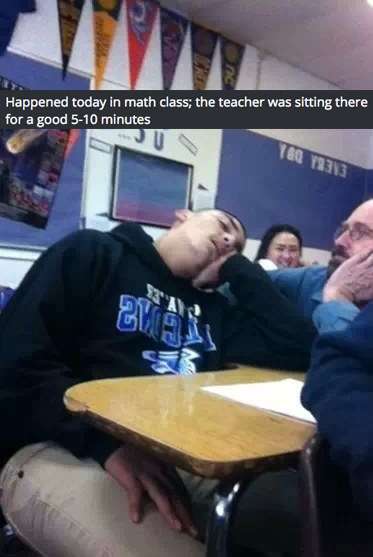 「他在上數學課時睡著了,老師就坐在那裡看了5到10分鐘。」