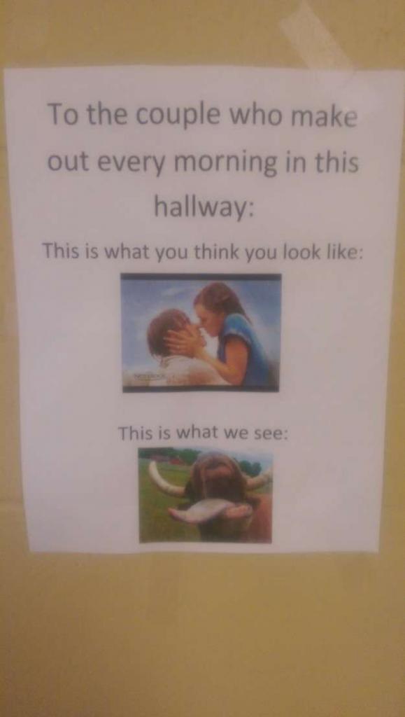 「致每天早上在走廊上熱吻的情侶:你們以為自己看起來是這樣;其實在我們眼裡是這樣。」