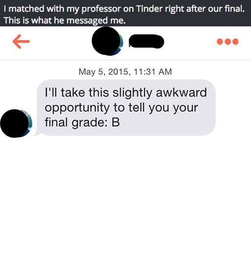 「期末考後,我跟教授在Tinder配對了,他給我傳訊息說:『我要用這個有點尷尬的機會跟你說你的期末成績:B。』」
