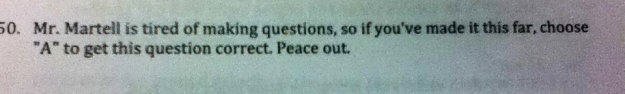 「馬提爾老師想考題想累了,你們如果做到這裡,只要這道題選A就算對啦。」