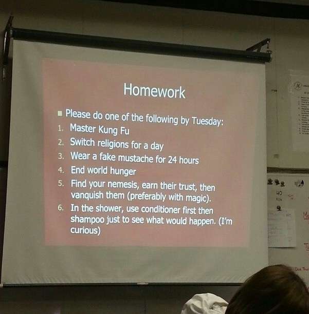 「作業:請週二前完成其中之一。1.成為功夫大師;2.換一種信仰過一天;3.戴一整天假鬍子;4.解決饑餓問題;5.找到你的涅墨西斯,贏得她們的信任,並征服她們(用魔法更好);6.洗澡的時候先用潤髮乳,再用洗髮精,看看會發生什麼事(我很好奇)。」