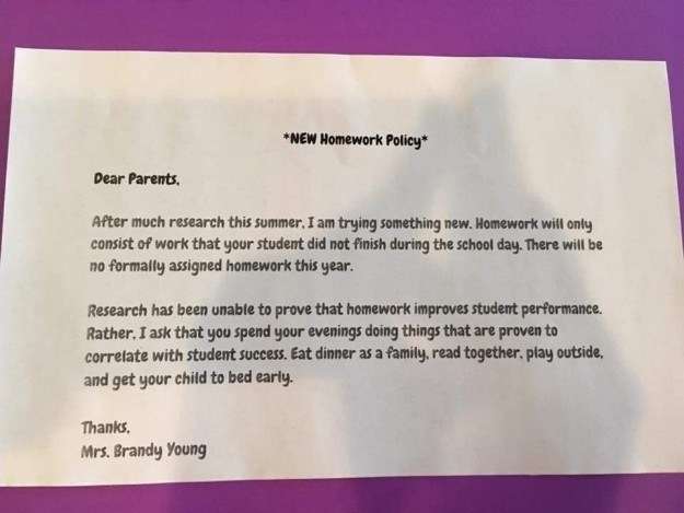 老師指定了新的作業政策:「親愛的家長們:這個夏天做了很多研究後,我要嘗試新的政策。家庭作業只是學生在學校期間沒做完的功課,今年不會有其他的家庭作業。研究無法證實家庭作業能增進孩子的表現。於此相對的,我請你們把晚上的時光花在已證實對學生的成功有益的事情上。一家人一起吃飯、一起讀書、一起到外面玩,讓孩子早點睡。謝謝。」