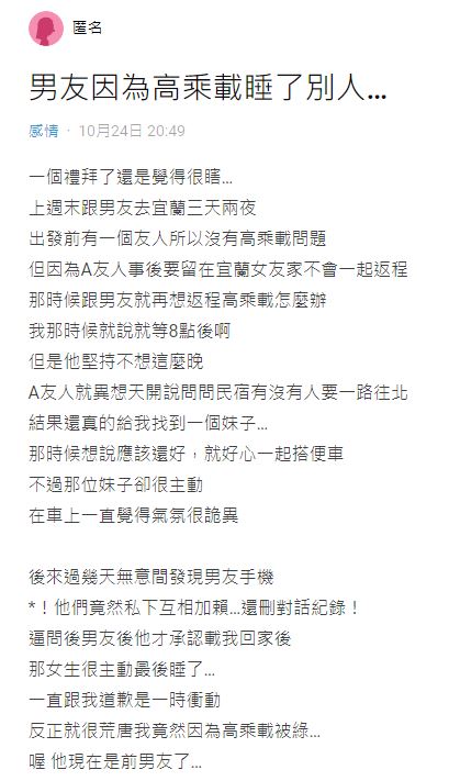 有女網友在《Dcard》上分享自己被劈.腿的心酸故事,表示跟男友去宜蘭三天兩夜,去的時候因為還有一個朋友,所以不用擔心高乘載問題,但是朋友要留下來陪女朋友,沒辦法一起回家,兩人就在想高乘載要怎麼辦,女網友表示,當時她認為就等八點過後,管制結束再上路就好,但男友卻堅持表示不想留到這麼晚。