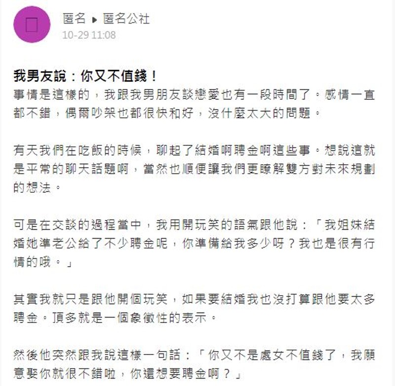 該名女網友接著說,平常與男友的相處方式都是AA制,因為男友先前連續失業好幾個月,她主動包下所有約會開銷,就連上旅館的費用也是她掏錢。在討論聘金時,男友還告訴她必須要有自知之明,她已經把初夜給別人了,應該要有自知之明主動降身價,怎麼還好意思談條件,說完後還補了一句「可是我是男的,所以不一樣」。