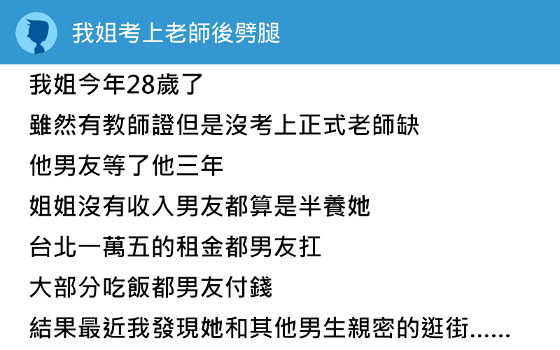 姊姊當了代課老師後竟看不起養她多年的男友…怒言 : 想分了!