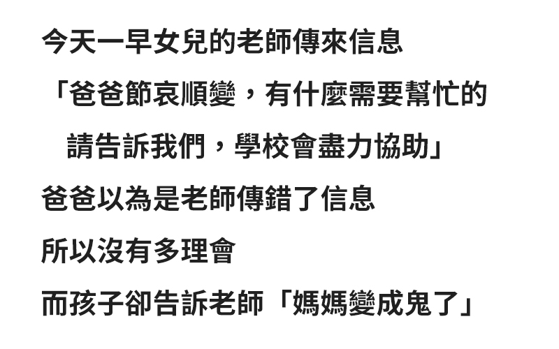 「爸爸節哀順變,有什麼需要幫忙的請告訴我們,學校會盡力協助。」爸爸以為是老師傳錯了信息,所以沒有多理會。而孩子告訴老師「媽媽變成鬼了」卻引起一場大烏龍。