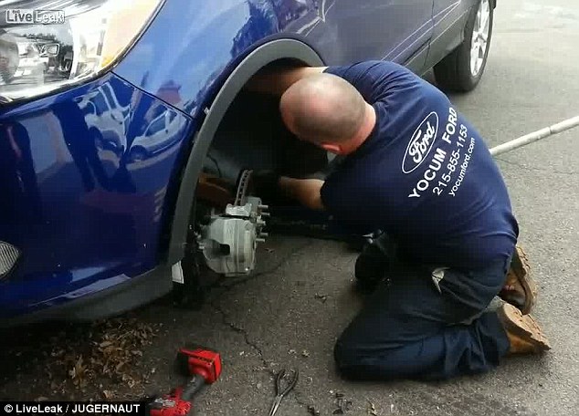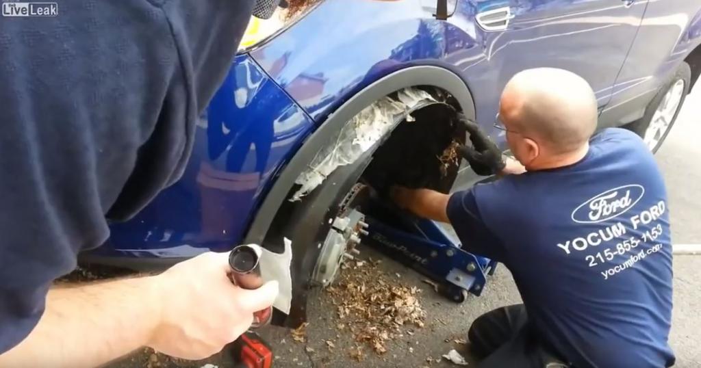 原來是一隻松鼠媽媽跑到汽車前輪築巢,還帶了許多適合當「家」的材料來到這,並在這裡生下了3隻松鼠寶寶,準備在這裡展開幸福的生活。 但畢竟車子才剛買沒多久,車主怎麼可能就這樣把車子送給松鼠們用,因此他只好逼不得已,請來專業人士前先幫忙…