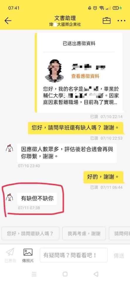 大家在找工作時,有時會習慣先傳訊問問人資「這個職缺還在不在」,沒想到竟有網友得到令人傻眼的回復,讓她好 難 過,是怎樣的公司這麼嗆辣?一起來看看!