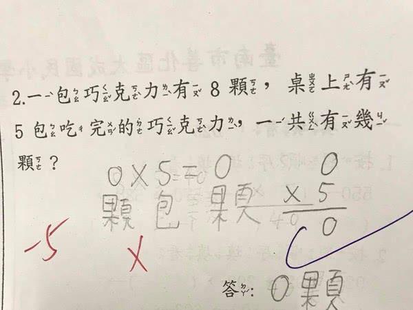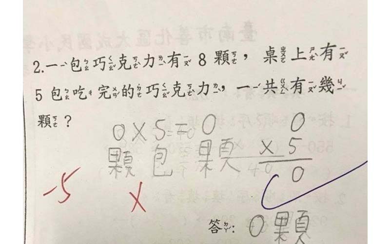 考卷題目上頭寫著:「一包巧克力有8顆,桌上有5包吃完的巧克力,一共有幾顆?」。她說,當下一拿到考卷也沒多想,所以直接回答「8乘以5等於40」,結果答案竟是錯的。