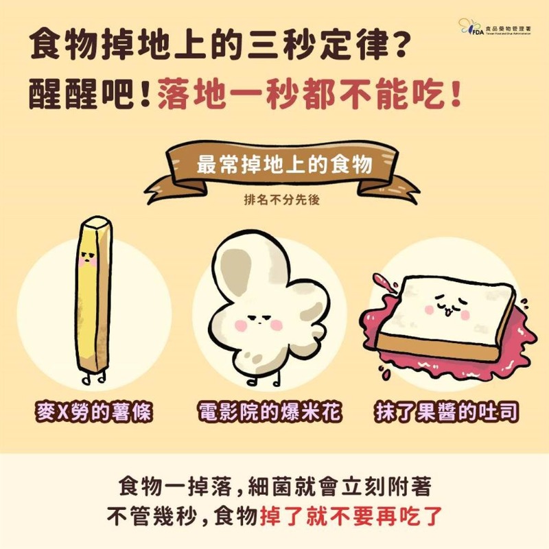 「醒醒吧!落地一秒都不能吃!」臉書粉專《食用玩家-食藥署》近日再次提醒民眾,沒有所謂的3秒定律,強調食物掉地上不管幾秒,細菌馬上就會附著,建議不要再食用,「若是不慎吃到病原菌,更可能引發食物中毒喔!」