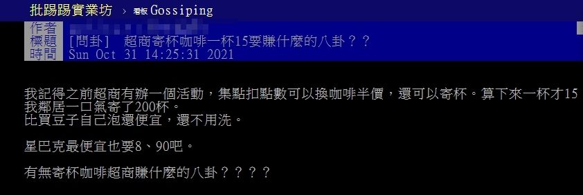 原PO於PTT中發文,他以「超商寄杯咖啡一杯15要賺什麼的八卦?」為題,表示之前超商有辦活動,集點可以換咖啡半價,還能使用寄杯服務,平均下來一杯才15元,相當便宜,「我鄰居一口氣寄了200杯,比買豆子自己泡還便宜,還不用洗」,為此好奇問:「有無寄杯咖啡超商賺什麼的八卦?」