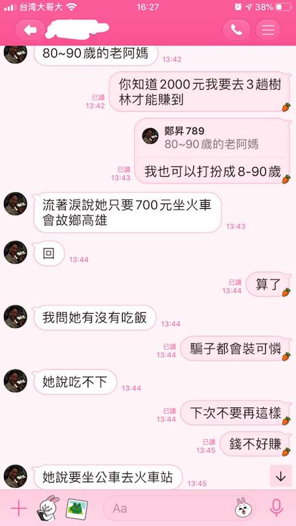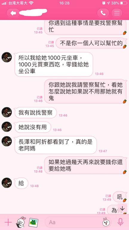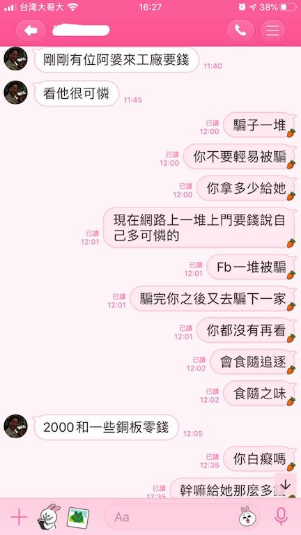有位人妻在臉書社團中PO出和丈夫的一系列對話截圖,只見對方先是老實交代,日前在上班的工廠裡,遇到了一位看上去高齡約8、90歲的阿嬤來討錢,「流著淚說她只要700元坐火車回高雄」,於是善良的丈夫就二話不說拿了2000元和一些銅板給她,氣得妻子看完後回:「你是白痴嗎,幹嘛給她這麼多錢?」