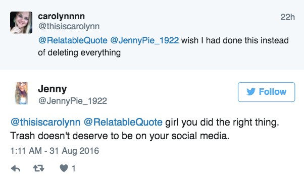 「女孩你做得太對了,垃圾不值得留在你的社交媒體上。」