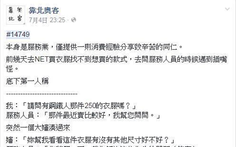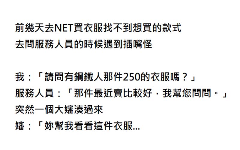 前幾天去NET買衣服找不到想買的款式,去問服務人員的時候遇到插嘴怪。